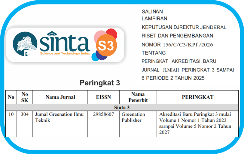 Jurnal Greenation Ilmu Teknik (JGIT) mulai Volume 1 Nomor 1 Tahun 2023 sampai Volume 5 Nomor 2 Tahun 2027 Terakreditasi Sinta Peringkat 3 sesuai nomor Akreditasi: No. 156/C/C3/KPT/2026, 7 April 202